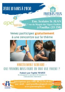 L’APEL St Jean de Pauillac organise le Jeudi 10 Mars à 19h30 une rencontre conférence sur le thème : Harcèlement scolaire, que pouvons nous faire en tant que parent ? Cette rencontre sera animée par Sophie MARIE.